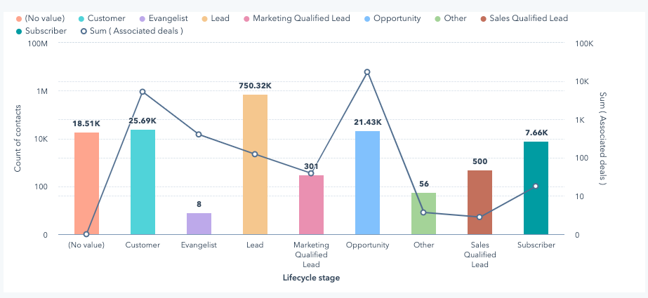 เมื่อคุณเพิ่มแกน Y ที่สองลงในแผนภูมิ HubSpot จะแปลงเป็นแผนภูมิแบบผสมโดยอัตโนมัติ จากนั้นคุณสามารถกำหนดค่าแต่ละแกน Y แยกกันได้ภายในการตั้งค่าของแผนภูมิ