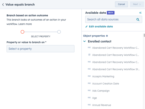 ใช้ Branch (กิ่งก้านสาขาของ Workflow) ประเภทนี้เพื่อส่งข้อมูลที่ได้เชื่อมต่อกับเส้นทางตาม Property และผลลัพธ์ของการกระทำบน Workflow ก่อนหน้านี้ ไม่สามารถกำหนดค่าของ Branch ประเภทนี้ด้วยเกณฑ์ AND และ OR แต่ละ Branch สามารถสร้างสาขาที่ไม่ซ้ำกันได้ถึง 250 สาขาสำหรับ Property เดียว