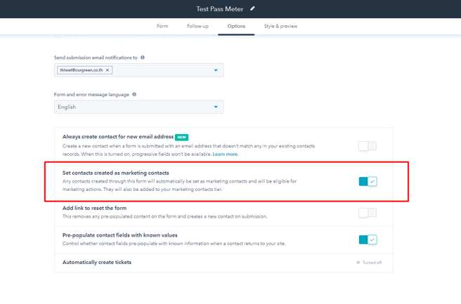 สำหรับ HubSpot Form แต่ละอัน, คุณสามารถเซต Contact ที่ถูกสร้างจาก Form เป็น Marketing Contacts ตั้งแต่ตอนแรกหลังจาก Submit form